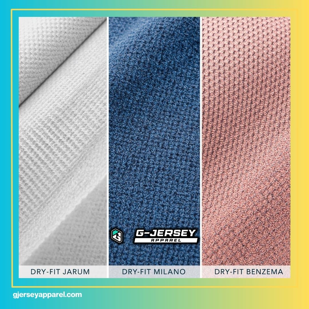 | Dry-Fit Milano | Tekstur pola zig-zag halus, sedikit lebih padat dari Jarum. | Tampilan lebih elegan, kain terasa lebih “jatuh” dan mewah. | Tim yang mencari kombinasi fashion dan performa, serta sedikit lebih tebal. |